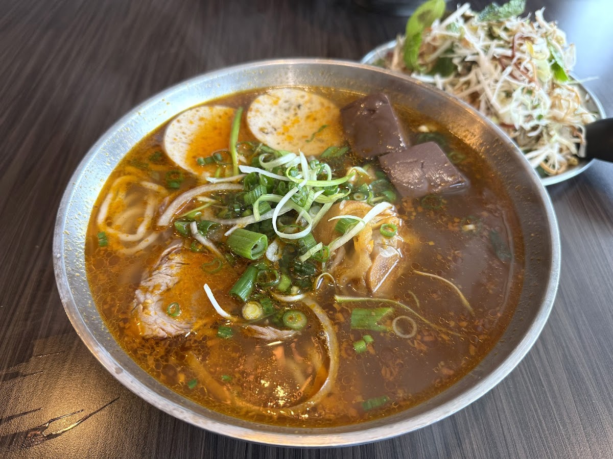 Another great Vietnamese BBH, clean restaurant inside and when I ordered Togo, they only have 1 Size. Came out to $16 with tax. Is it worth $16? I would say yes but borderline. The soup is amazing, flavorful, porky, very strong aromatic flavors, spicy, and you can taste the fish sauce in the broth. I love the noodles, they are bouncy, thicker than the traditional noodles, and each bite is a more fuller bite. The leaves, cilantro, onions, banana blossom, mint leaves, water spinach, love how the restaurant gives you a lot. The slices of meat are great, the pork bone with the fat is nice, overall great BBH. For $16, I definitely want more than 2 micro pieces of pork blood cubes. That's the best part of BBH, it needs more and 1 more slice of pork loaf or aka cha lua, then it's more value.